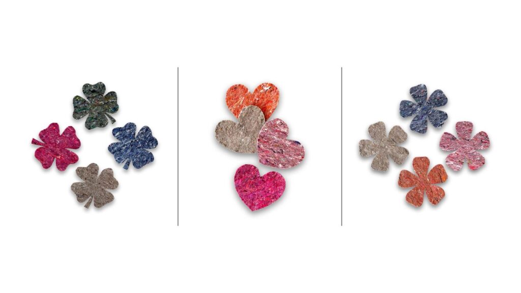 Nieuw in de collectie zijn de hart – bloem en klavertje 4 figuren van gerecycled vilt.